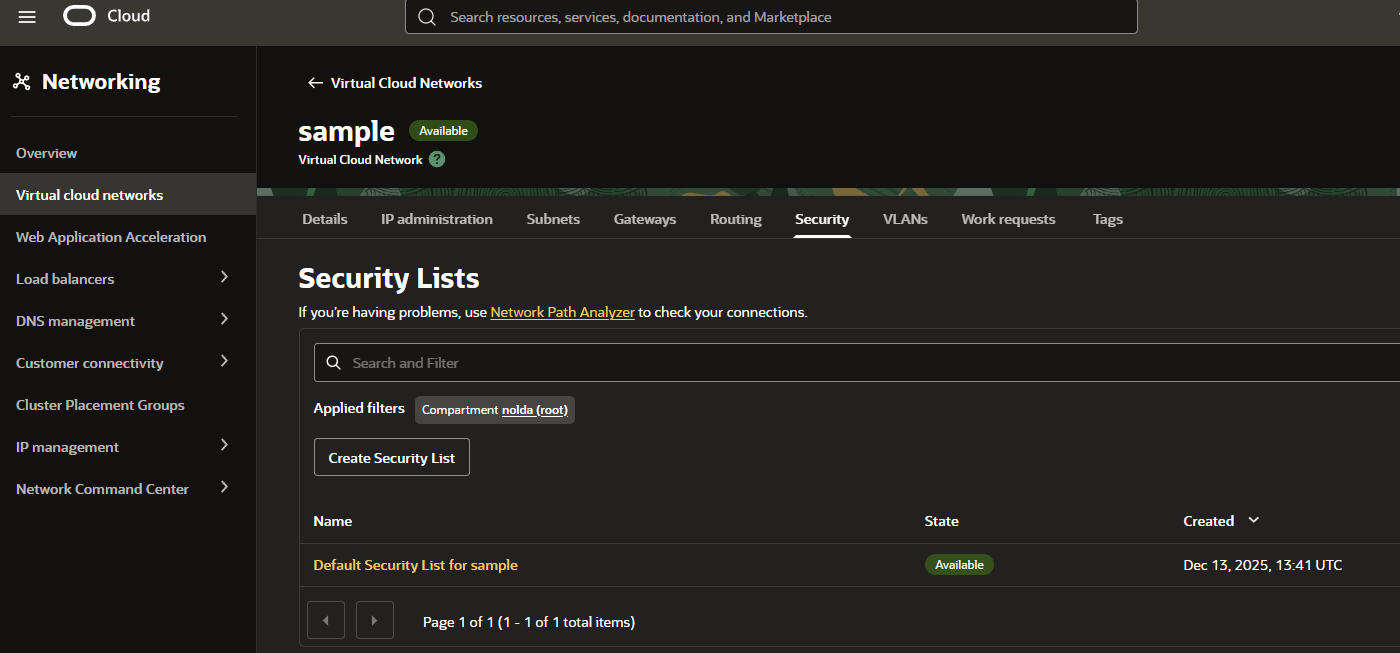Virtual Cloud Networks(이하 VCN)에서 사용 중인 VCN의 Detail로 접근한다. 그 뒤, Security 탭으로 이동한다.