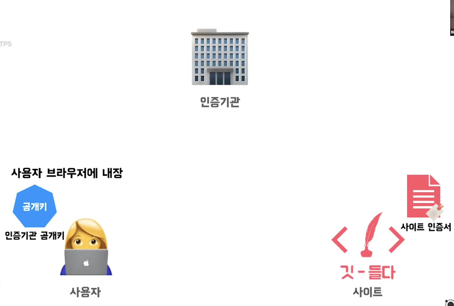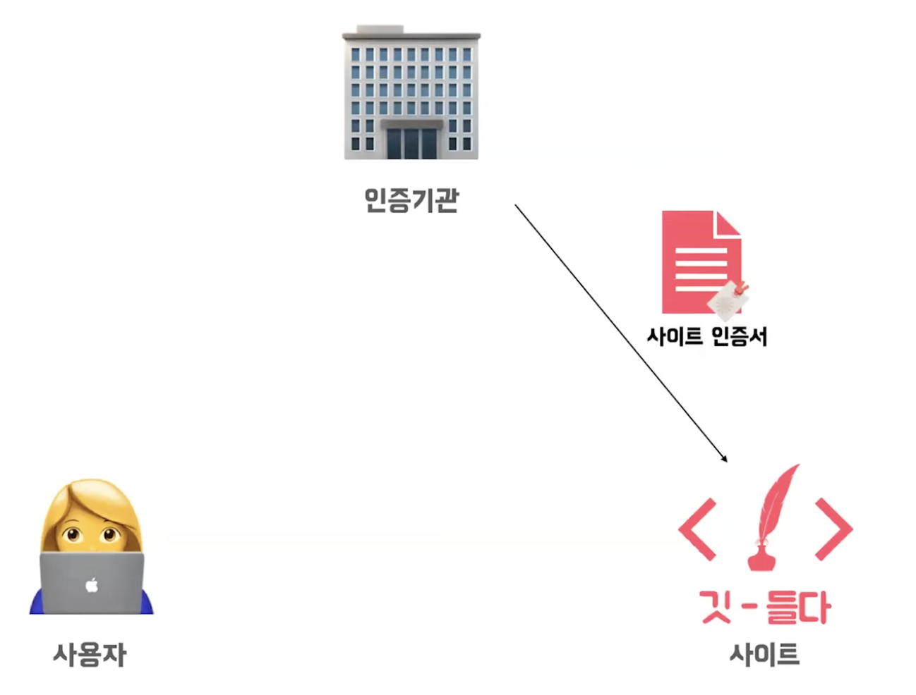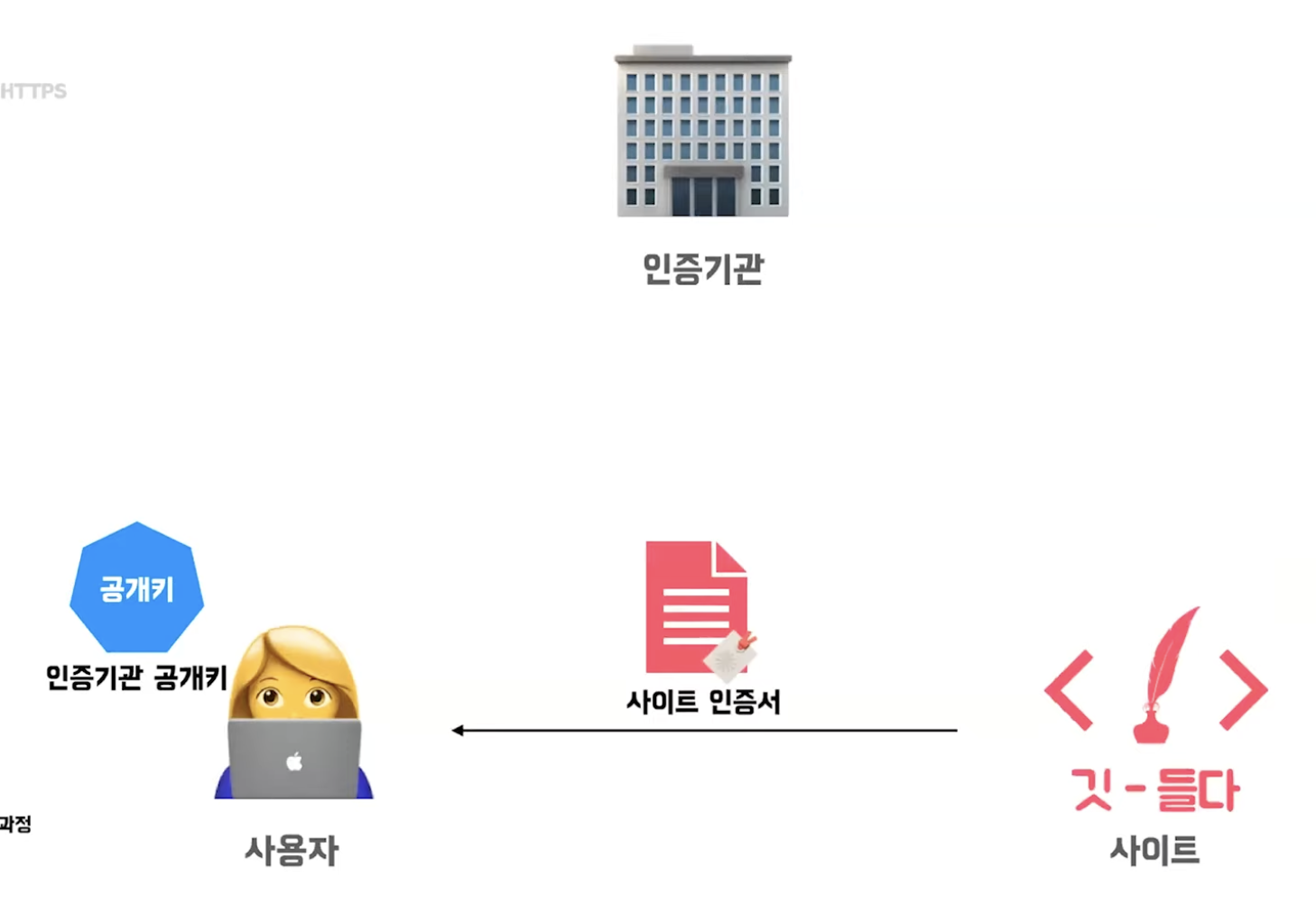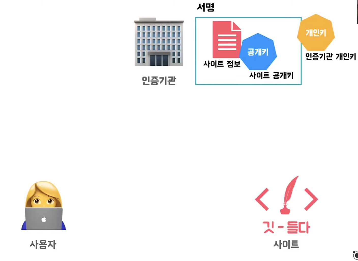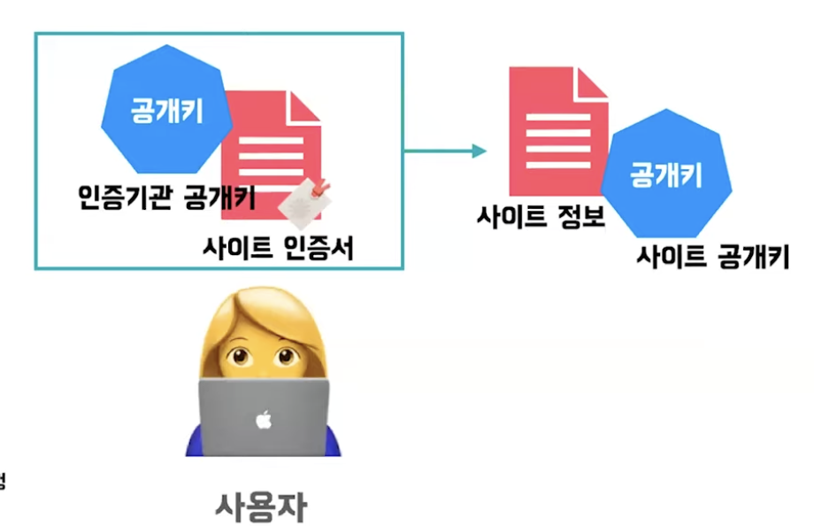 사용자 브라우저에 인증기관 공개키가 자동으로 내장된다. 그리고 사이트는 사이트 인증서를 받은 상태이다.