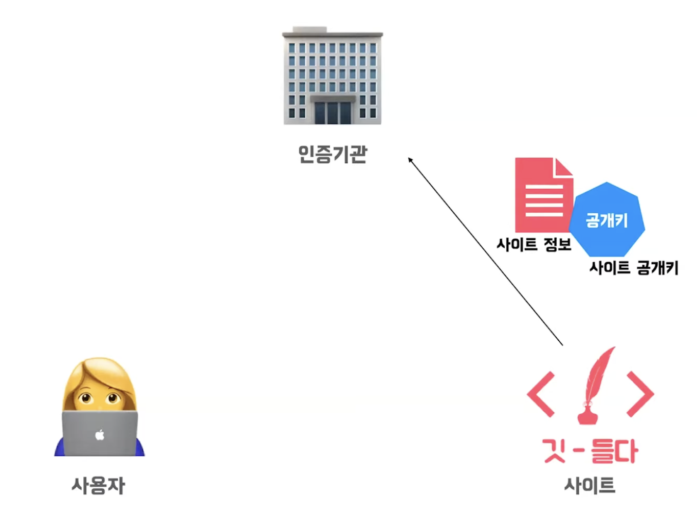 먼저, 사용자가 사이트 접속 요청하면 사이트는 자신이 신뢰할 수 있는 사이트임을 증명하기 위해 사이트 인증서를 보낸다.