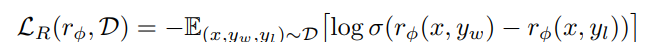 이후에는 각 pair에 대한 선호로부터 전체 선호도를 모델링하는 bradley-Terry 모델 등을 기반으로 Reward Model을 학습하며, NLL Loss 형태로 이를 나타내면 아래와 같다.