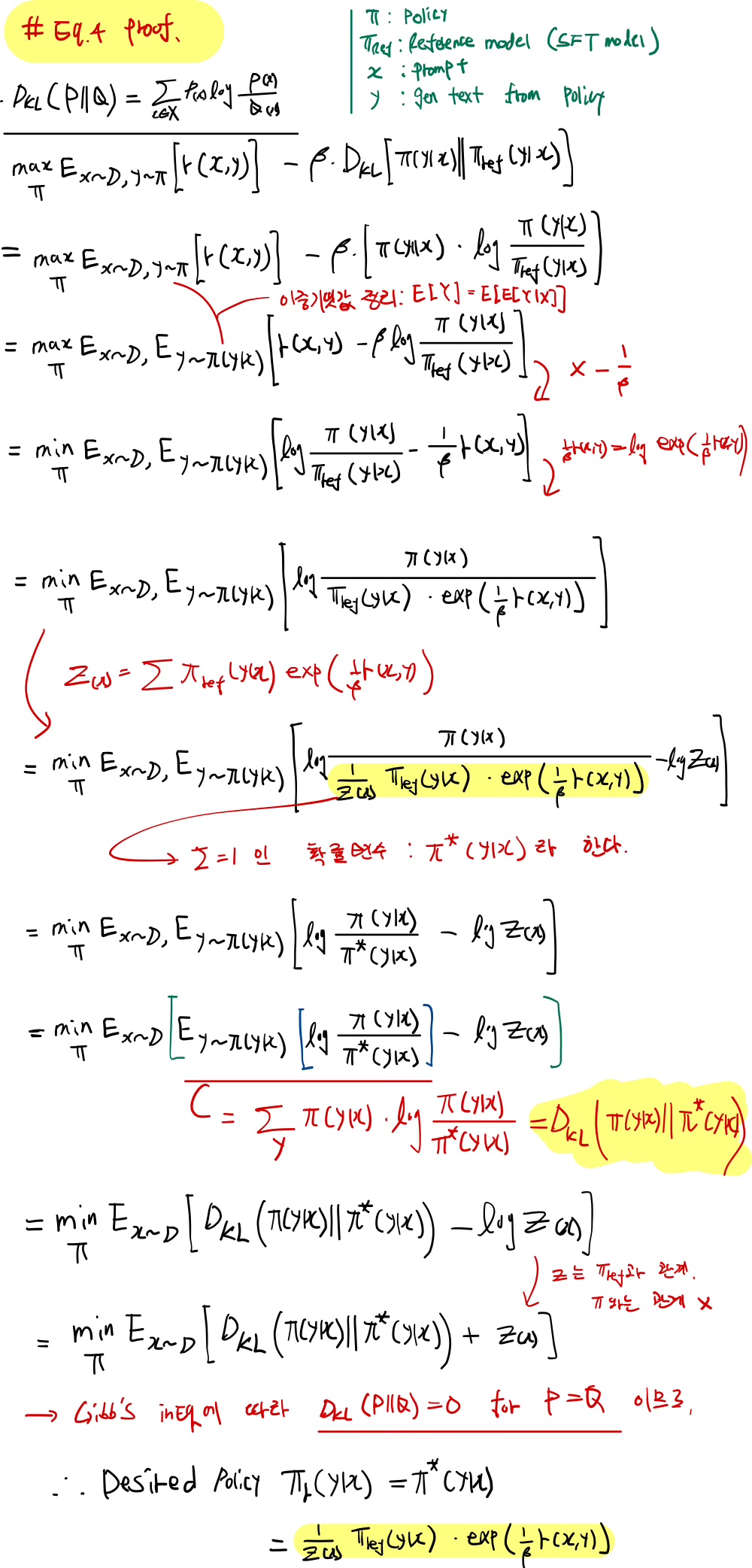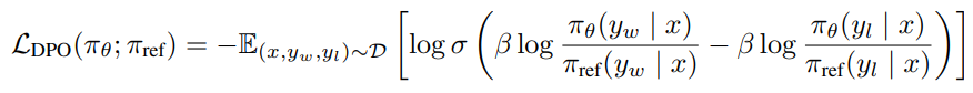 논문에서 제시하는 DPO는 위 3)의 KL-constrained objective를 변형하여 아래의 새로운 objective로 만들어낸다.