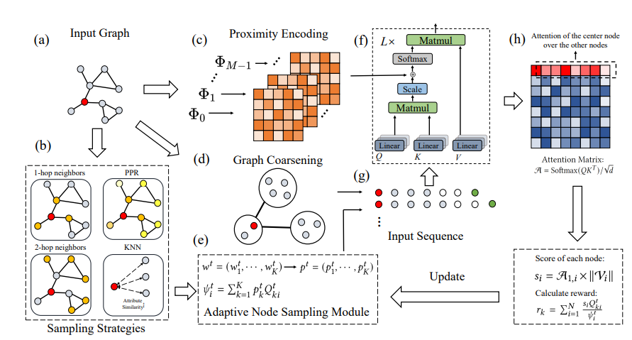 이렇게 구한 확률을 바탕으로 N개의 노드를 sample해서 Transformer Archetecture의 input으로 넣고, 그 과정에서 나온 Attention Weight Matrix A의 첫 row A1을 사용해 각 노드의 significance score si를 구한다.
