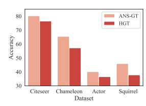 Apdaptive Node Sampling을 적용하지 않고 Hierarchical Graph Transformer만 적용한 모델 Vs ANS-GT의 Node Classfication Accuracy 비교