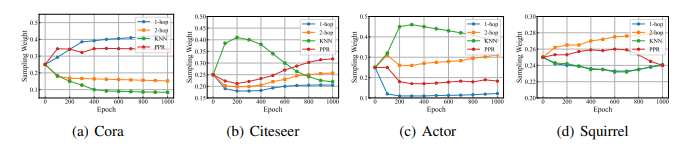 각 benchmark dataset에서 4개의 Sampling Methods(1-hop / 2-hop neighbor, KNN, PPR)의 Sampling weights가 학습 초반에는 급격히 변하다 점점 안정화되는 경향 보임.