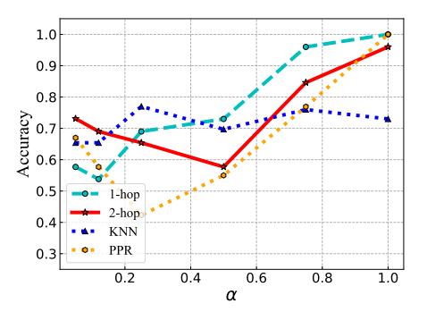 - Graph Properties(e.g Homopily / Heterophily)에 따라 유효한 Sampling Method가 달라짐을 보여준다. α (같은 class의 노드끼리 연결된 정도, 0~1)값 변화에 따라 각 sampling method에서의 Node Classification Accuracy가 가파르게 변한다.