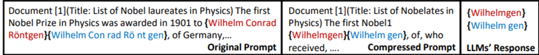이는 Token level compression의 결과로 정답 entity의 형태가 무너지는 현상을 완화하기 위한 모듈입니다. 아래를 보면 Compression 과정에서 si가 낮은 토큰을 없애는 과정에서 정답 entity가 변형(일부 토큰 삭제)되고, Prompt에 있는 entity를 그대로 뱉는 LLM의 경향에 따라 최종 prediction도 변형되는 문제를 볼 수 있습니다.