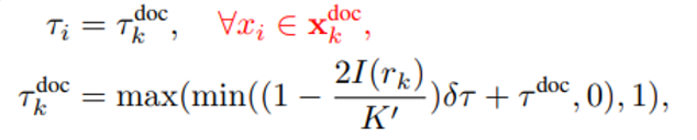이후에는 전체 prompt를 구성하는 3가지 요소인 instruction, question, document마다 각기 다른 compression ratio τins,τque,τdoc을 이용해 token level compression을 합니다. 다만 τins,τque는 predefined이고, τkdoc는 아래와 같이 계산합니다.