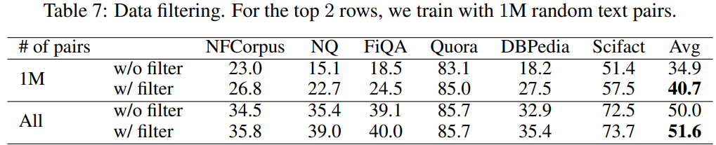 아래 table 7은 위에서 언급한 data filter의 ablation result인데, 첫 2개 행은 1M개의 데이터만 사용했을 때, 아래 2개 행은 전체 270M개 데이터만 사용했을 때의 결과이다.
