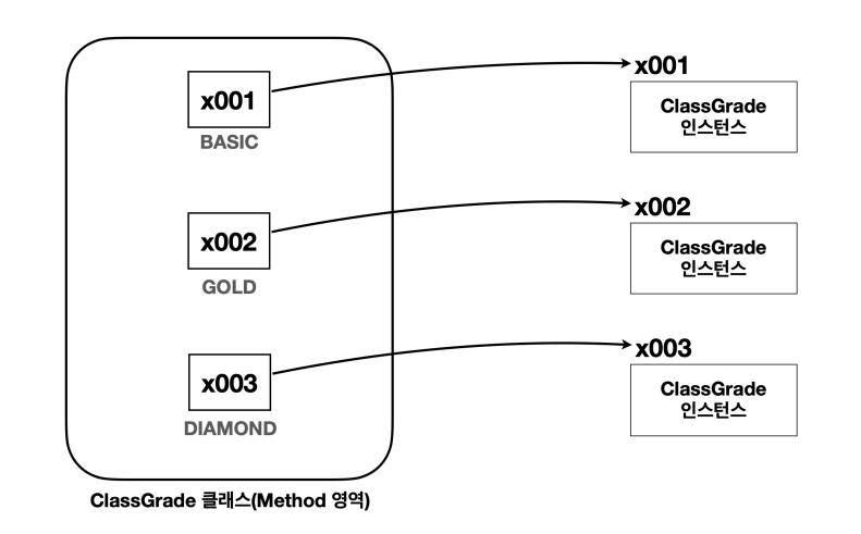 제약이 발생하지 않는 이유는 String타입에 맞게 코드가 작성되었기 때문이다. 즉, 컴파일 과정에서 에러는 발생하지 않기에 개발자가 런타임에서 디버깅을 직접하여 문제점을 파악해야한다. 위의 문제를 해결하려면 등급(grade)을 특정 값으로 제한해야 한다. 즉, 등급으로 반드시 BASIC,GOLD,DIAMOND만 적용되도록 해야한다.