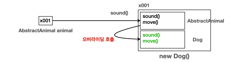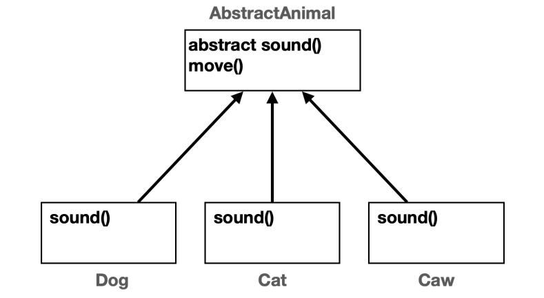 위의 AbstractAnimal 추상 클래스를 살펴보면, 추상 메서드인 sound()와 일반 메서드인 move()로 이루어져 있음을 알 수 있다.