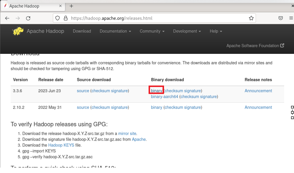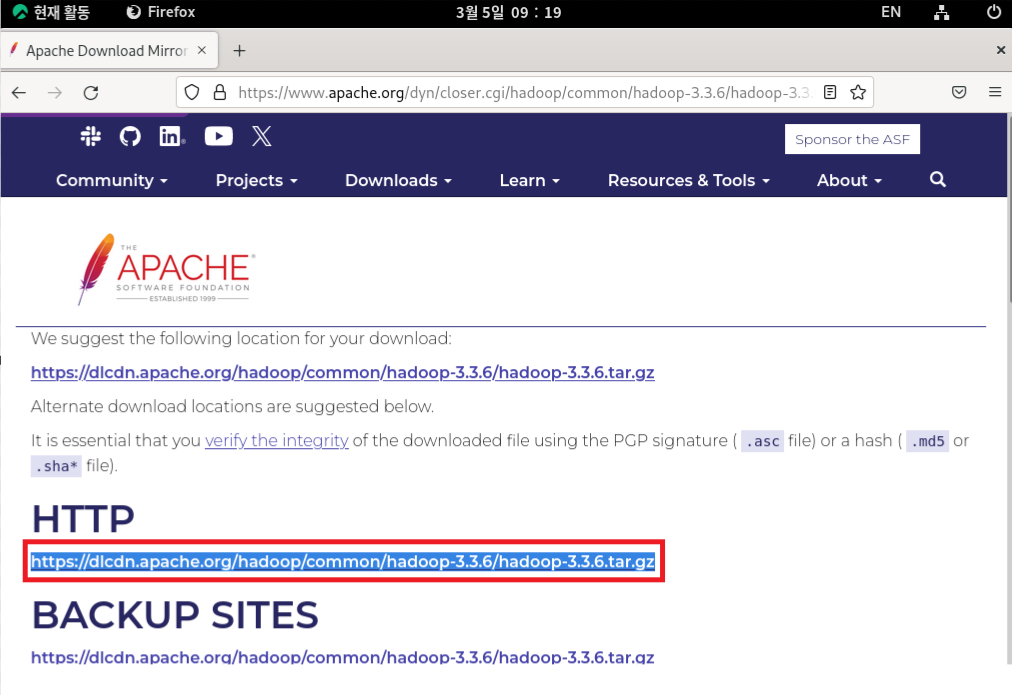 VMware station의 firefox에서 Apache Hadoop사이트로 들어가 링크를 복사한다.