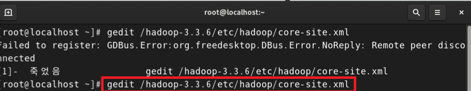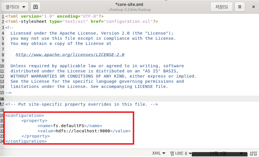 - fs.defaultFS 속성을 사용하여 HDFS (Hadoop Distributed File System)의 기본 주소를 hdfs://localhost:9000으로 설정