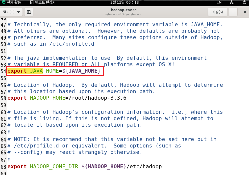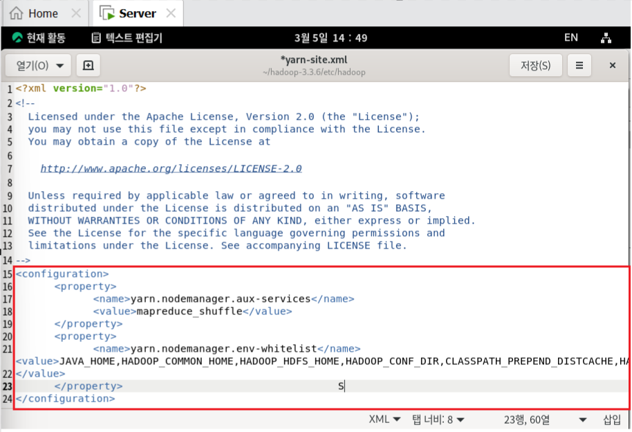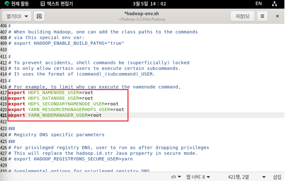 따라서 hadoop-env.sh에서 datanode, secondarynamenode, resourcemanager,nodemanager 설정을 추가로 진행한다.