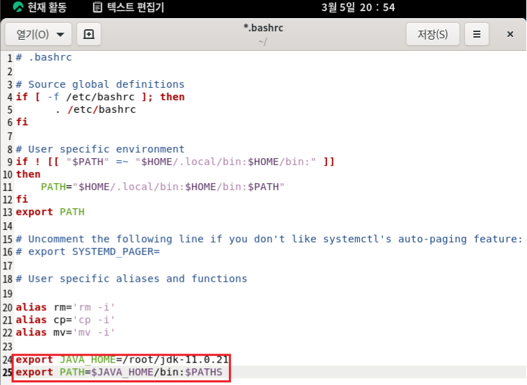 - source ~/.bashrc를 통해 .bashrc 파일을 실행하여 해당 스크립트에 포함된 환경 설정을 현재 셸 세션에 적용한다.