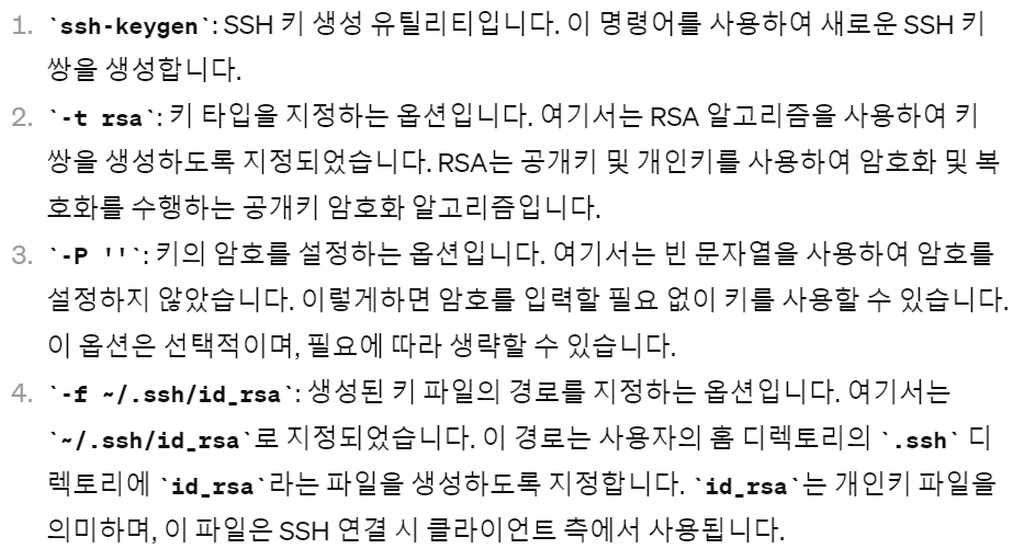- RSA 키 쌍을 생성하고 암호를 설정하지 않고 개인키 파일을 ~/.ssh/id_rsa에 저장. 이 키는 SSH 연결을 수립할 때 사용