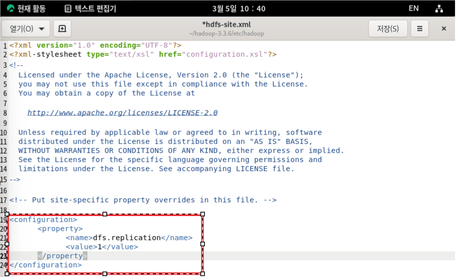 2.dfs.replication 속성의 값을 1로 설정. 이것은 HDFS에서 파일의 복제 수를 1로 설정한다는 것을 의미