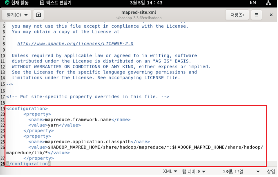 Hadoop MapReduce의 설정 파일 , 이 파일을 사용하여 MapReduce 작업에 대한 설정을 지정할 수 있음. 예를 들어, 매퍼 및 리듀
