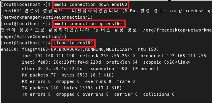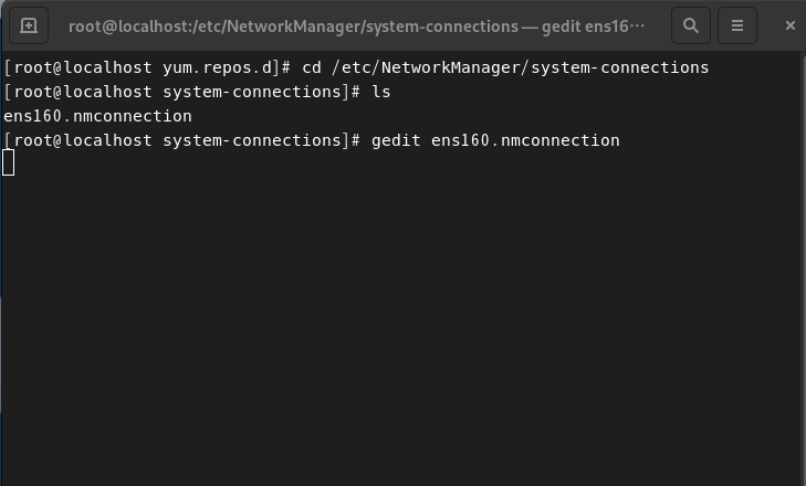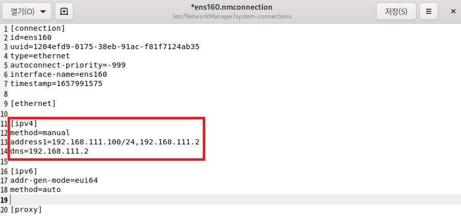 gedit을 통해 ens160(네트워크 장치명)에 대한 설정값을 수정한다. gedit은 문서를 여는 명령어.