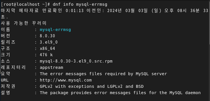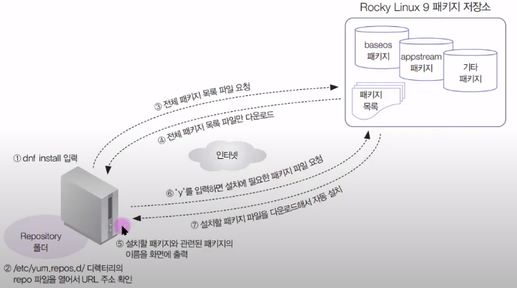 - /etc/yum.repos.d/에는 여러개의 파일이 존재하는데, 각 파일에는 dnf 명령을 실행했을 때 인터넷에서 해당 패키지 파일을 검색하는 네트워크 주소가 들어 있다.