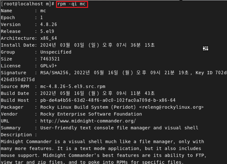 - rpm -qi mc 를 통해 'mc'파일이 설치되어 있는지 확인