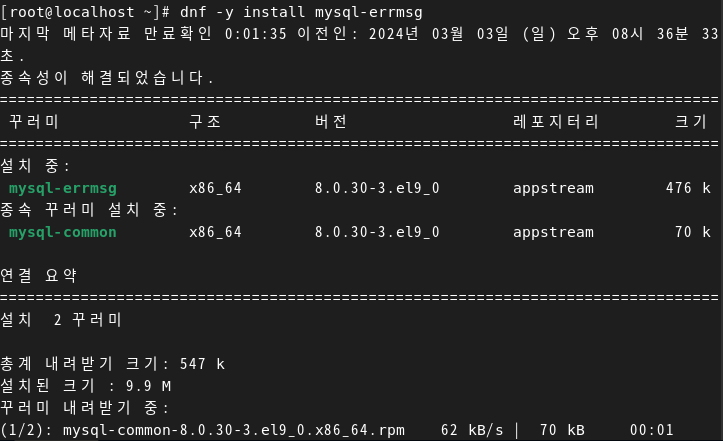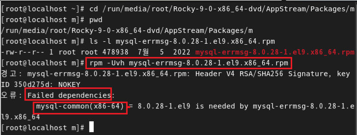 - rpm -Uvh mysql~ 를 통해 mysql관련 패키지를 설치하려고 했으나 해당 패키지를 설치하기 위해선 mysql-common파일의 설치가 필요하기에 의존성 문제가 발생한 것을 알 수 있다.