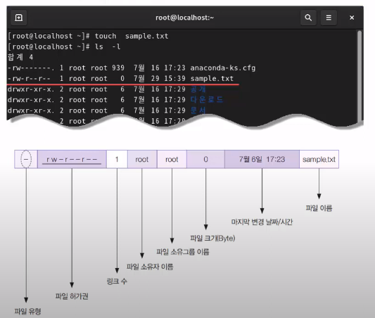 - ex. sample.txt 파일은 root가 소유자이며, root 그룹에 속해있다