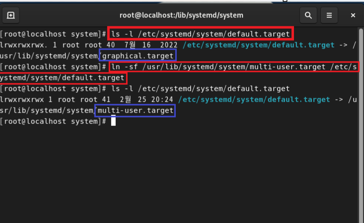 - ln -sf /usr/lib/systemd/system/multi-user.target /etc/systemd/system/default.target으로 default.target을 multi-user.target으로 바꿈