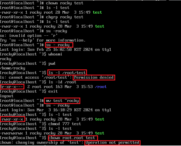 - chown rocky test : test파일의 소유권을 root -> rocky로 바꿈