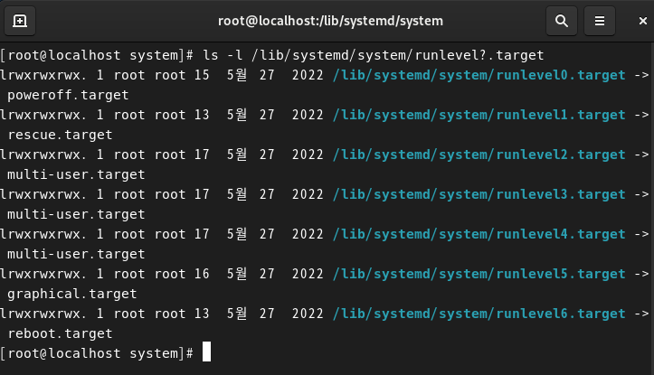 - /lib/systemd/sytem으로 디렉토리 이동 후 runlevel?.target파일을 확인하면 된다.