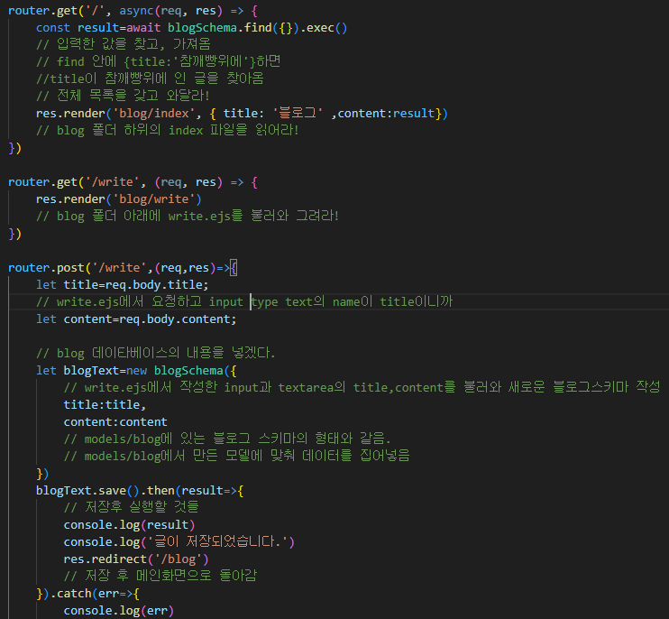 const blogSchema =require('../models/blog')로 아까 만든 blog 모델을 호출한다.