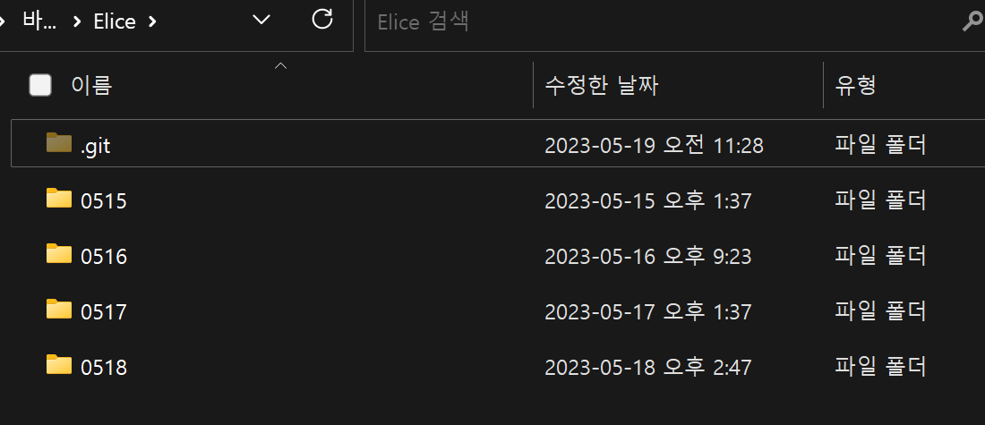 현재 실습 코드를 올리고 있는 Elice 폴더의 경로창에 cmd를 입력해 git init을 적용하니