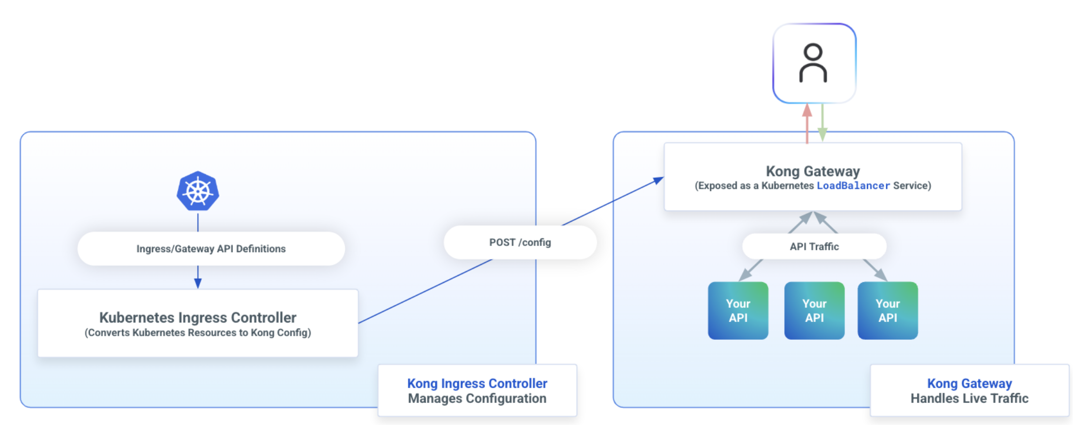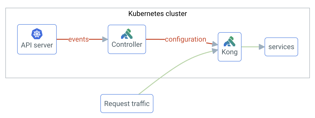 Kong Ingress Controller는 Kong Gateway를 Kubernetes Ingress로 실행하여 Kubernetes 클러스터에 대한 인바운드 요청을 담당할 수 있도록 한다. KIC는 Ingress 또는 HTTPRoute와 같은 k8s resource를 생성하면 유효한 Kong gateway configuration으로 변환시켜준다.