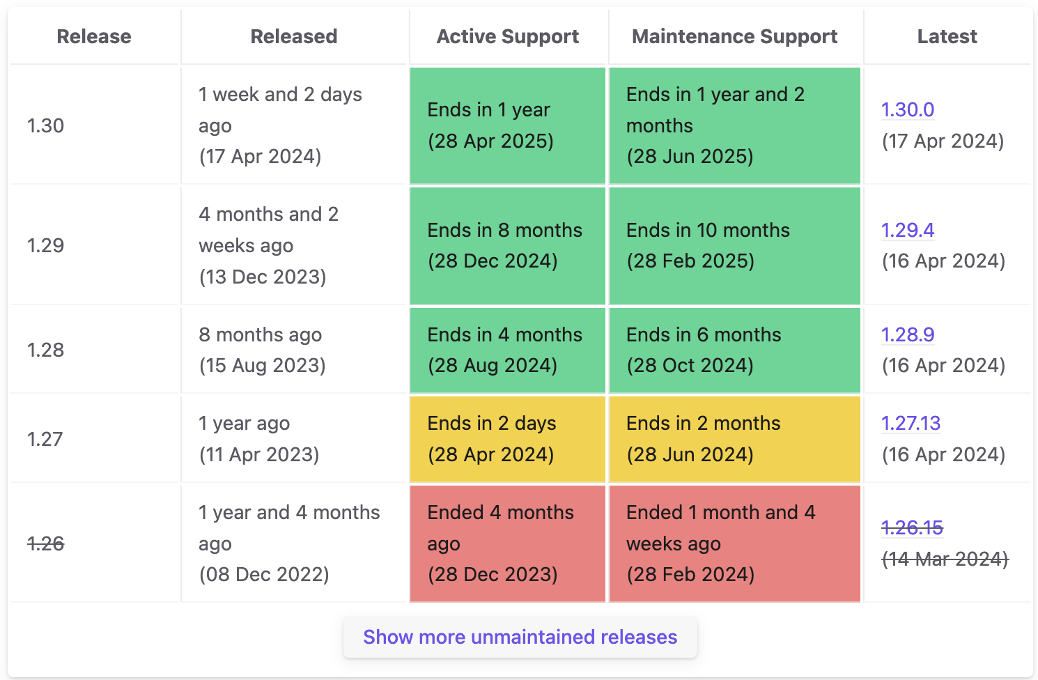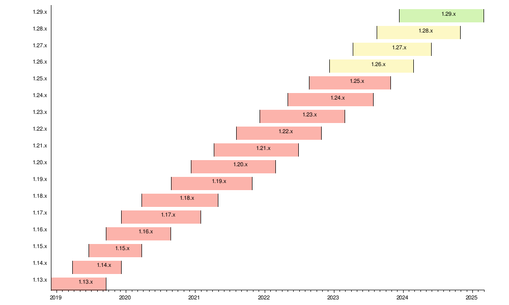 Kubernetes는 15주 릴리스 주기와 함께 N-2 지원 정책(최신 3개의 minor버전이 보안 및 버그 지원을 받음)을 따름. 결과적으로 릴리스는 14개월 동안 지원됨(12개월 지원 및 2개월 업그레이드 기간).