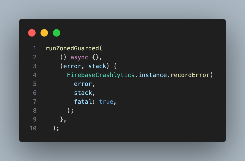 이제 발생한 에러를 어떻게 받아와서 어떻게 표기할지 정의하는 함수를 작성해야 한다. 메인 함수로 가서 runApp과 아까 초기화한 부분 전체를 runZonedGuarded 로 감싼다.