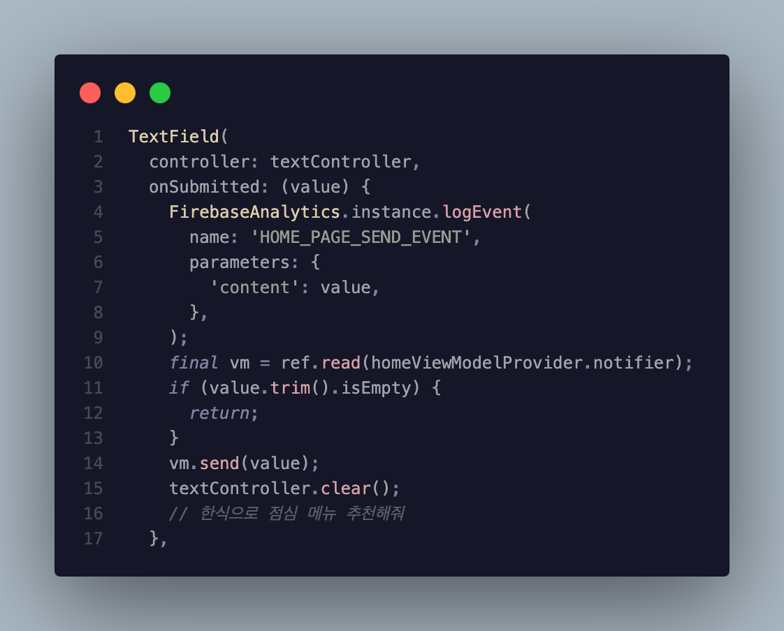 HomePage에서 TextField 위젯을 만들고 실행 코드 부분에 FirebaseAnalytics.instance.logEvent 를 넣었다.