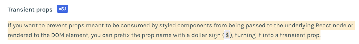 문제를 해결하기 위해서는 props앞에 $를 붙여주면 된다. $를 붙이면 props를 임시 props로 만들어 DOM 요소로 렌더링되지 않도록 한다.