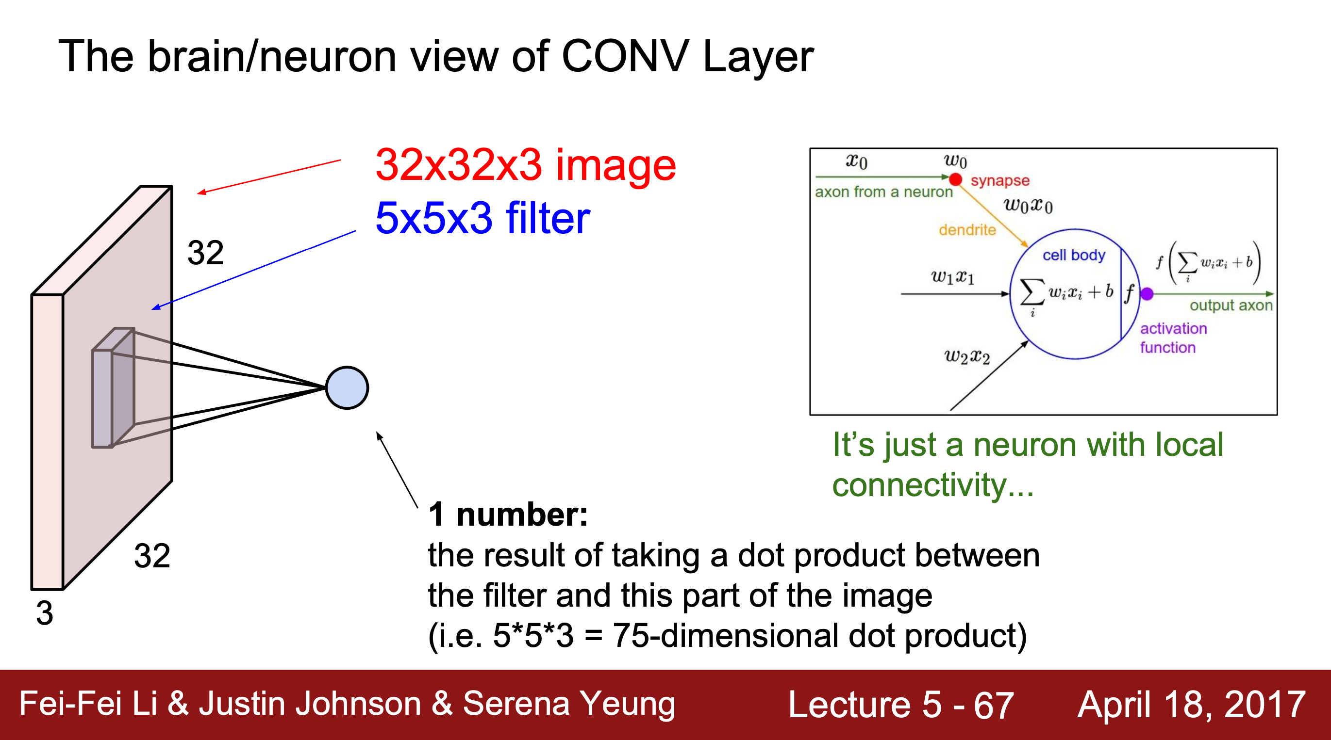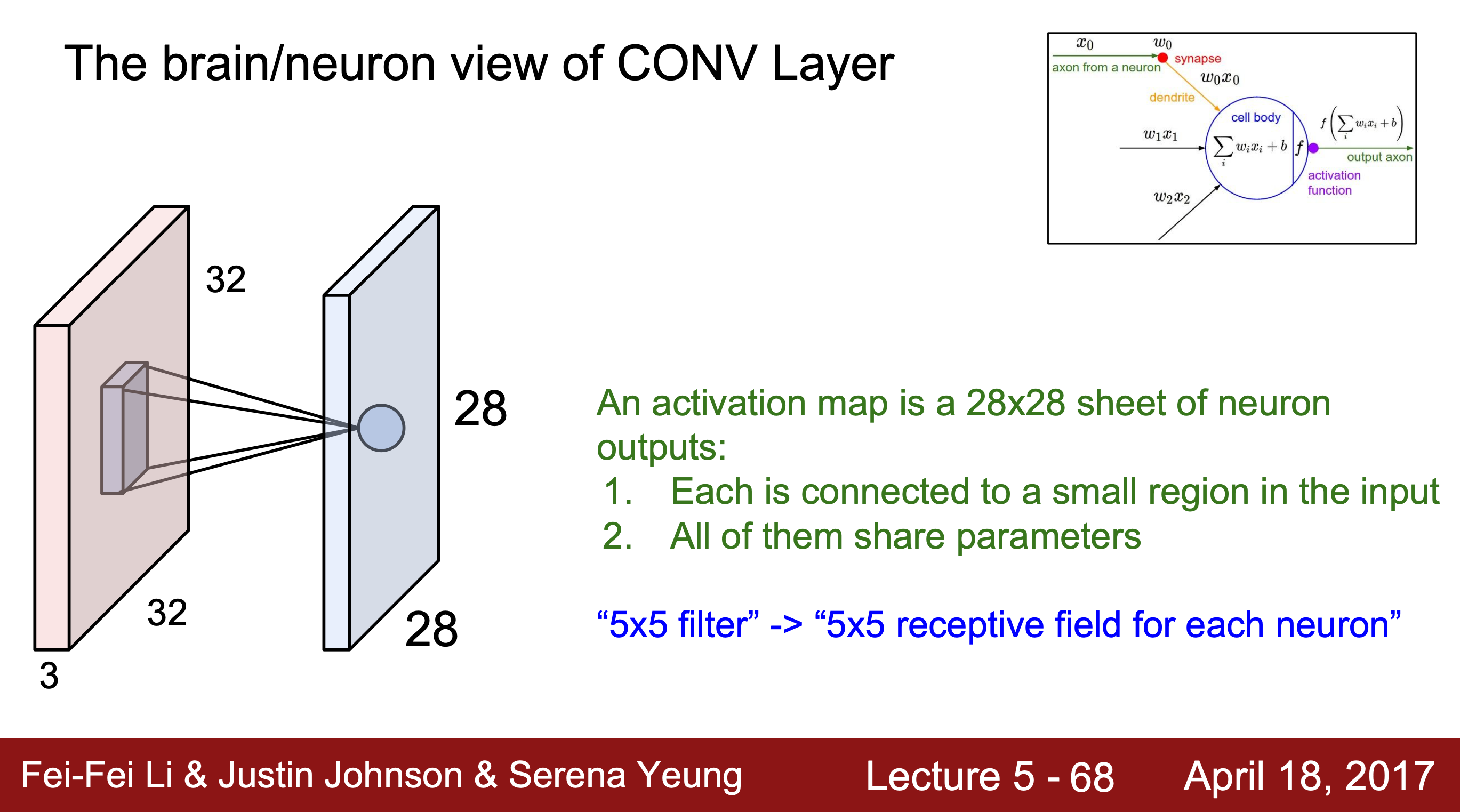activation map은 뉴런의 출력이고 각각이 입력 이미지의 국소적인 부분과 연결된다. filter는 receptive field of each neuron(각 뉴런의 수용체)와 같은데, 특정 부분만 처리하고 이것이 여러 개가 모여서 전체 이미지를 보게 되는 것과 유사하다.