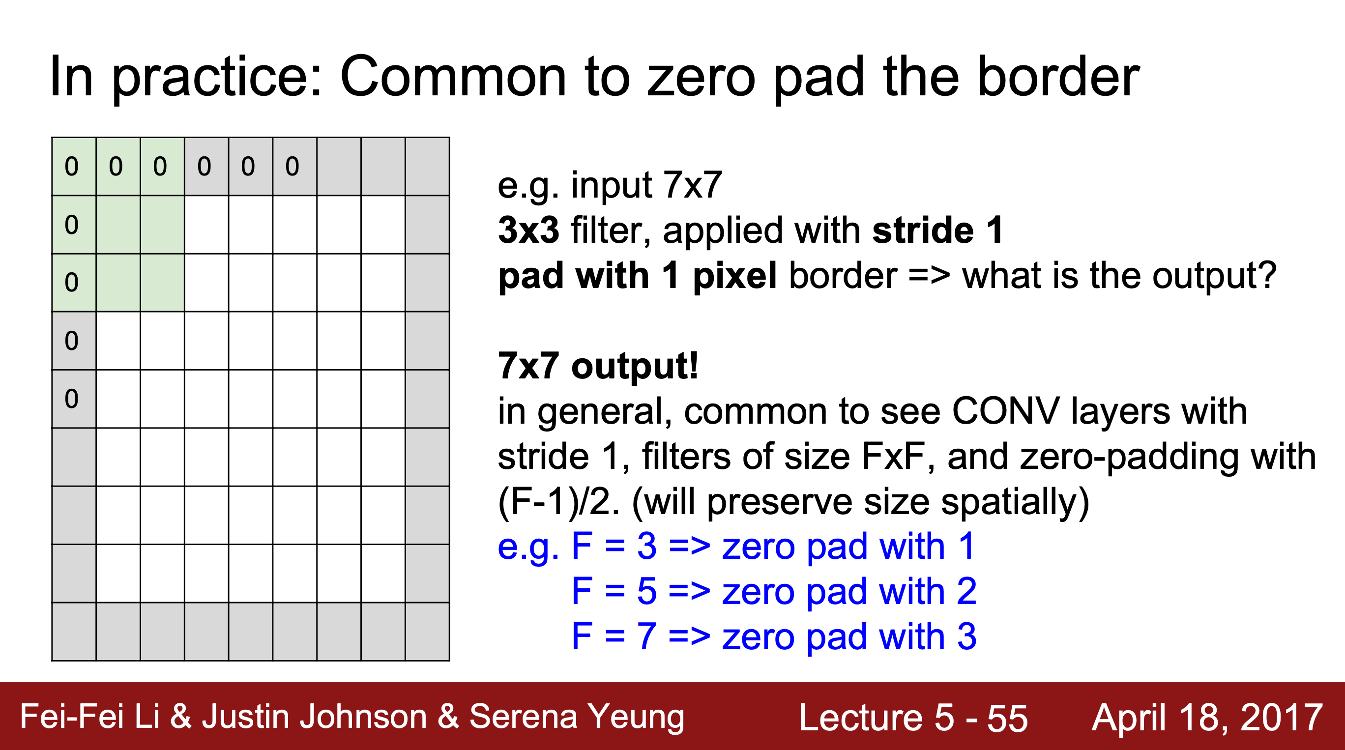 입력 이미지에 딱 맞게 슬라이딩할 수 있는 보폭이 아닌 경우, 정보의 일부가 누락된 불균형한 정보를 가진 activation map을 얻게 된다. 이를 해결하기 위해 Zero Padding을 사용한다.