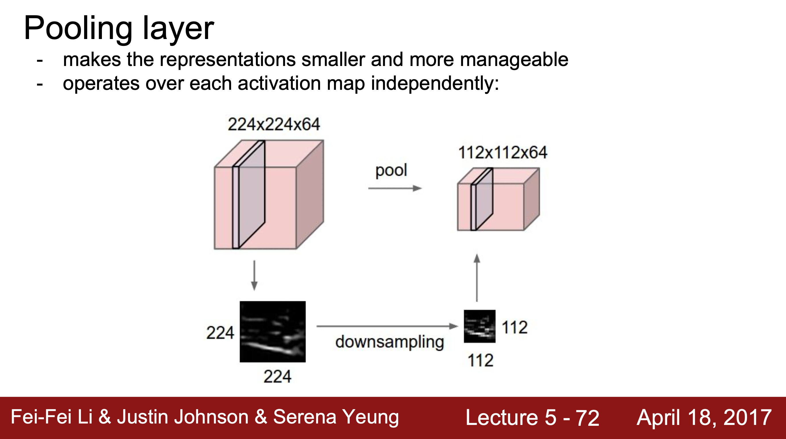 Pooling Layer : downsampling으로, representation(표현)의 크기를 줄여 관리하기 쉽게 만들어준다. 각 activation map에 독립적으로 작용하는데 공간의 크기(차원)은 줄여주지만 depth는 줄이지 못한다.