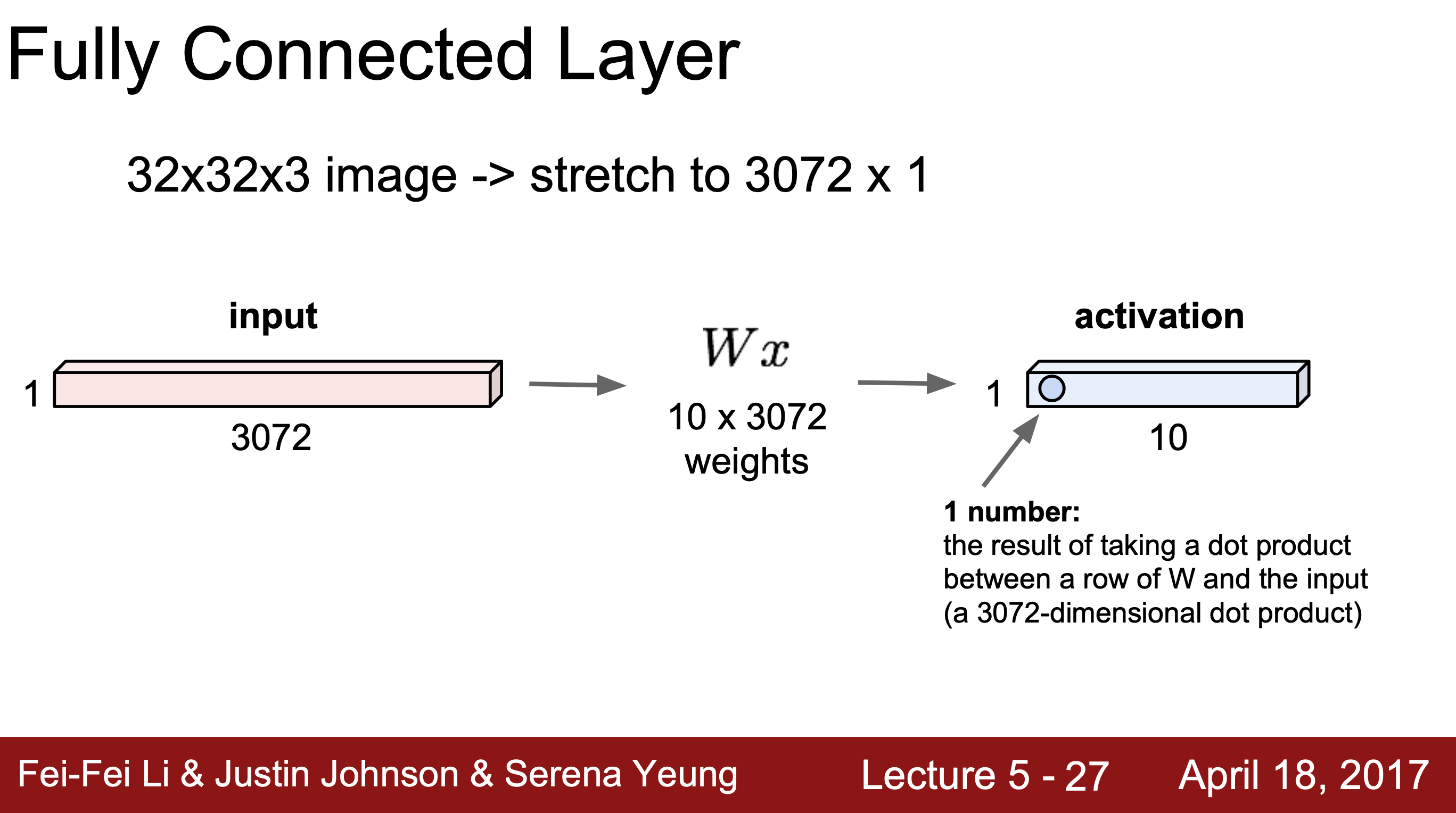 Fully Connected Layer(FC layer) : 입력 이미지를 늘려서 1차원 벡터로 만들어 가중치 W와 내적을 계산해 1개의 결과값을 activation layer에 출력한다.