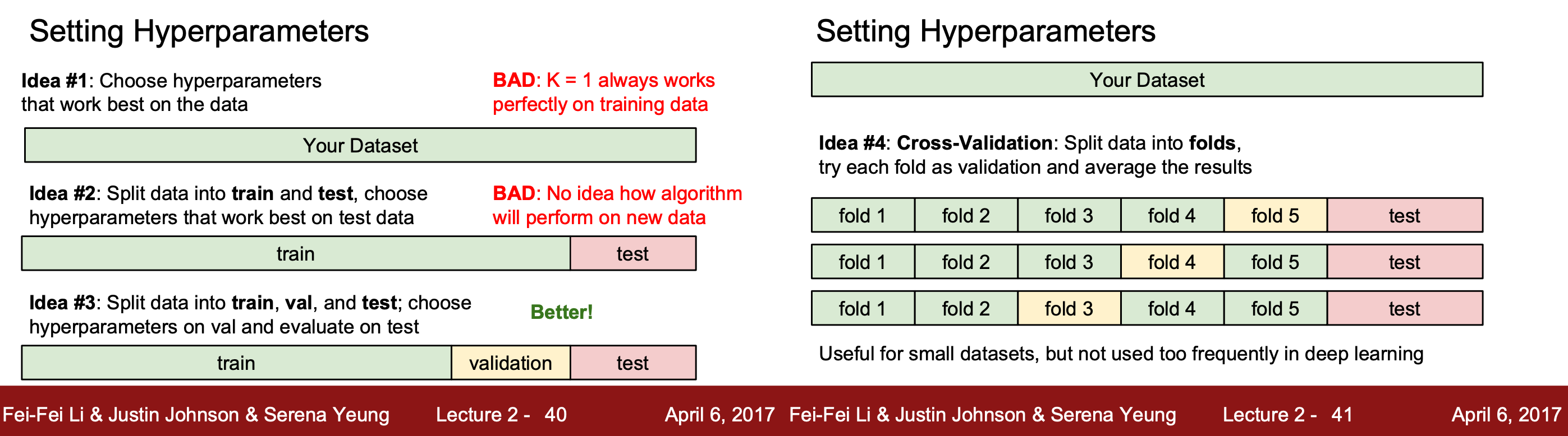 데이터가 작을 때 주로 사용한다. 테스트 데이터를 제외한 나머지 데이터들을 폴더로 분할하고 폴더로 나눈 것 중에 하나씩만 hyperparameters로 설정하여 결과를 확인하고 평가하는 과정을 반복한다.