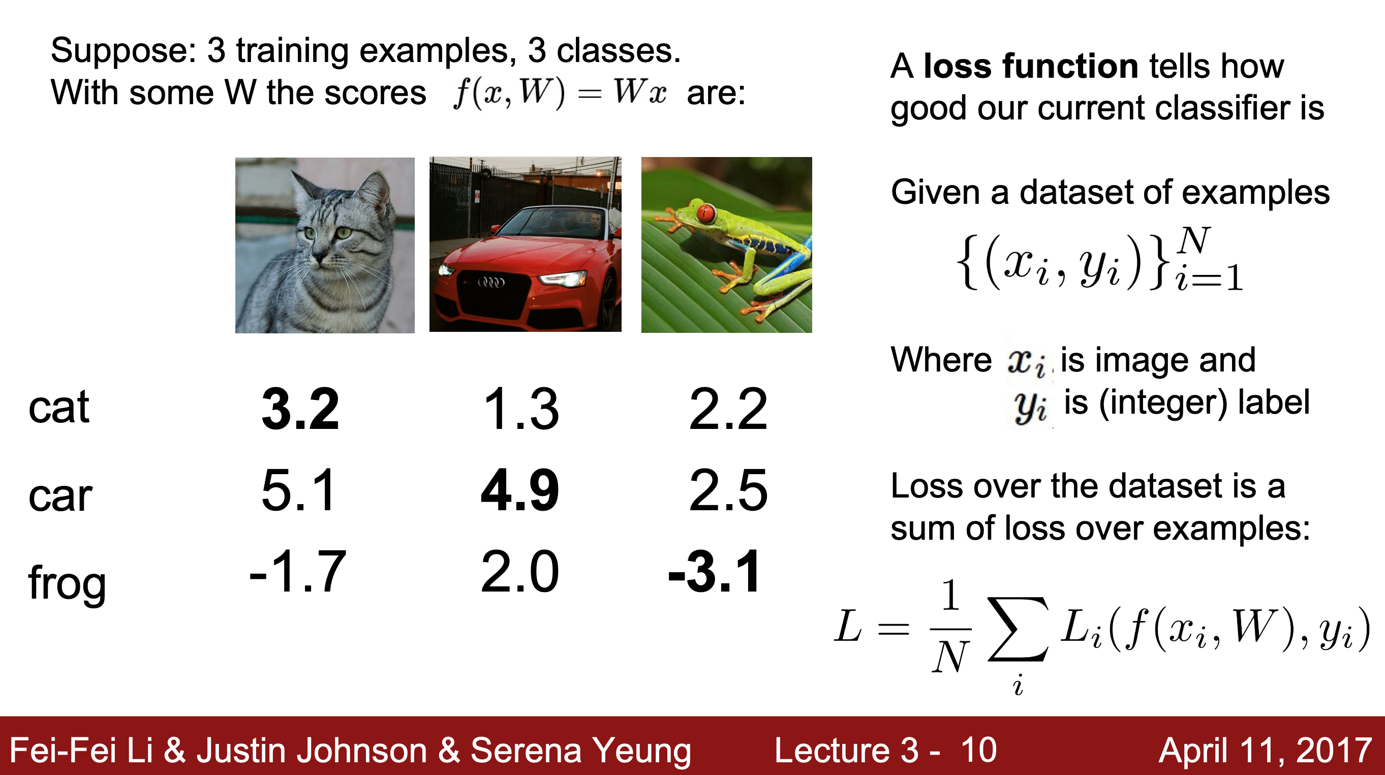Loss function : score(점수)를 이용해 이에 영향을 준 임의의 W를 수량화하여 W가 얼마나 나쁜지 알려주는 함수
