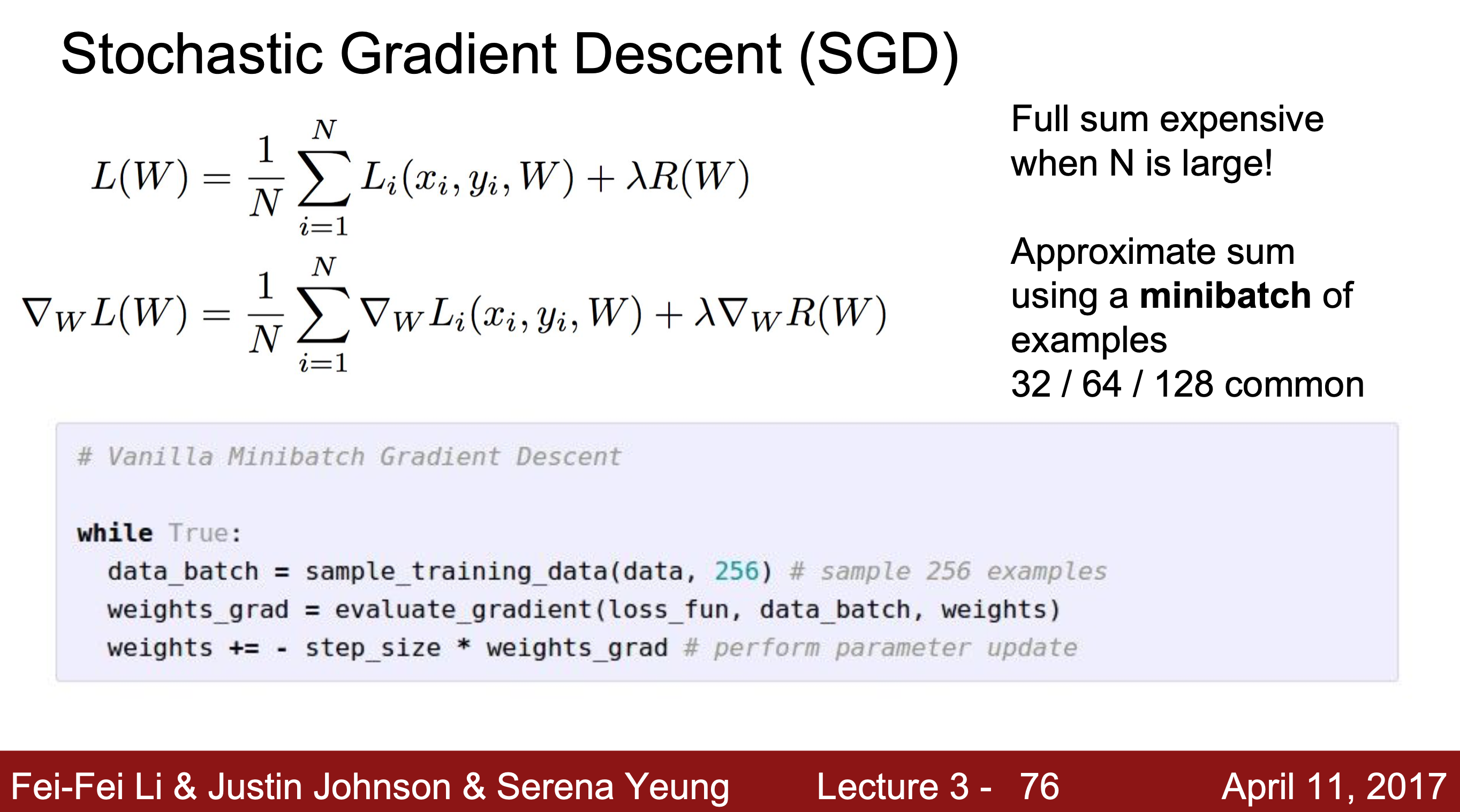 모든 데이터에 대해 작업할 때 연산량을 줄이기 위해 minibatch(묶음)를 이용하는데 이 방법을 Stochastic Gradient Descent(SGD)라고 한다. 일부분을 사용해 gradient를 계산한다.
