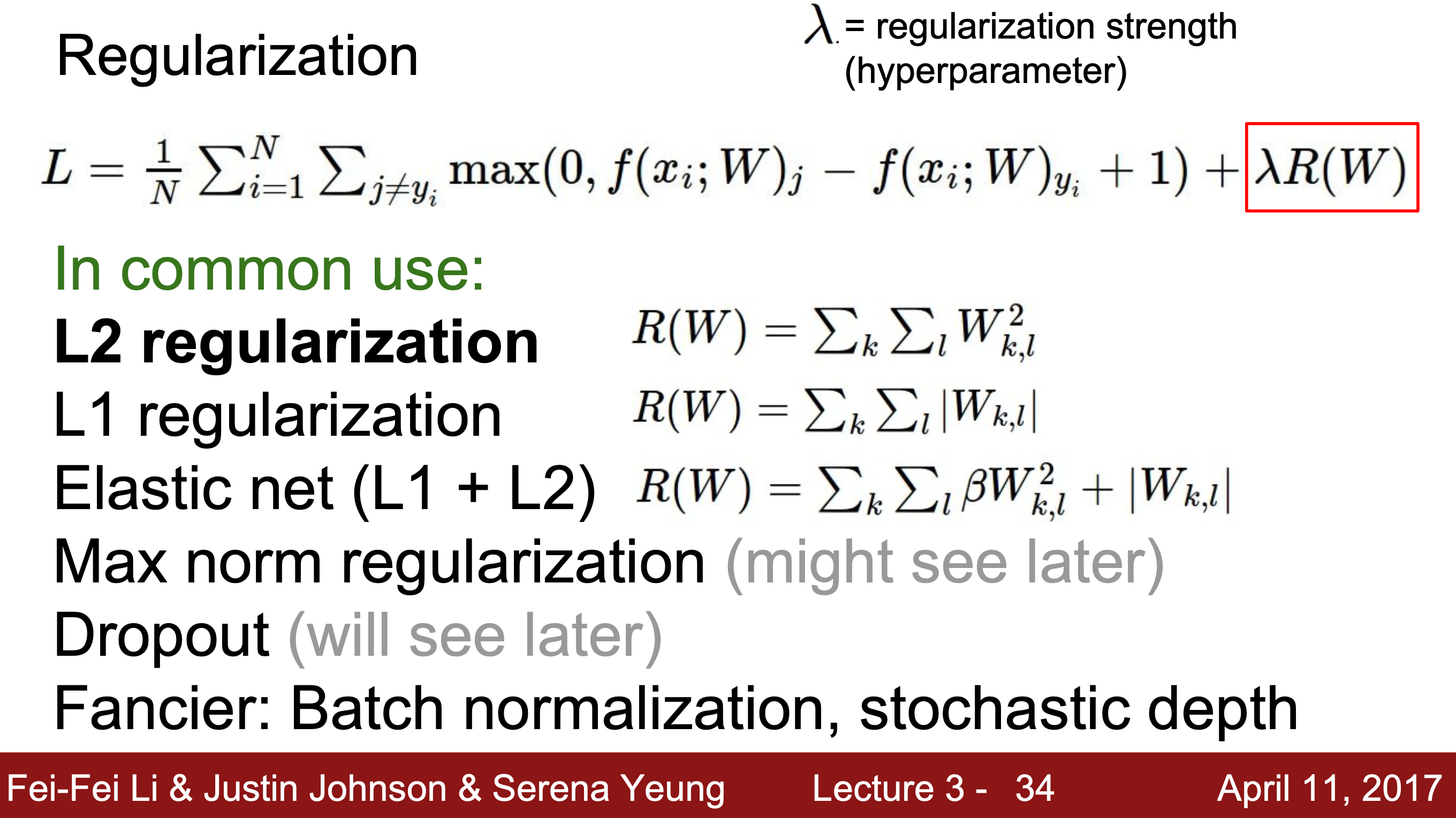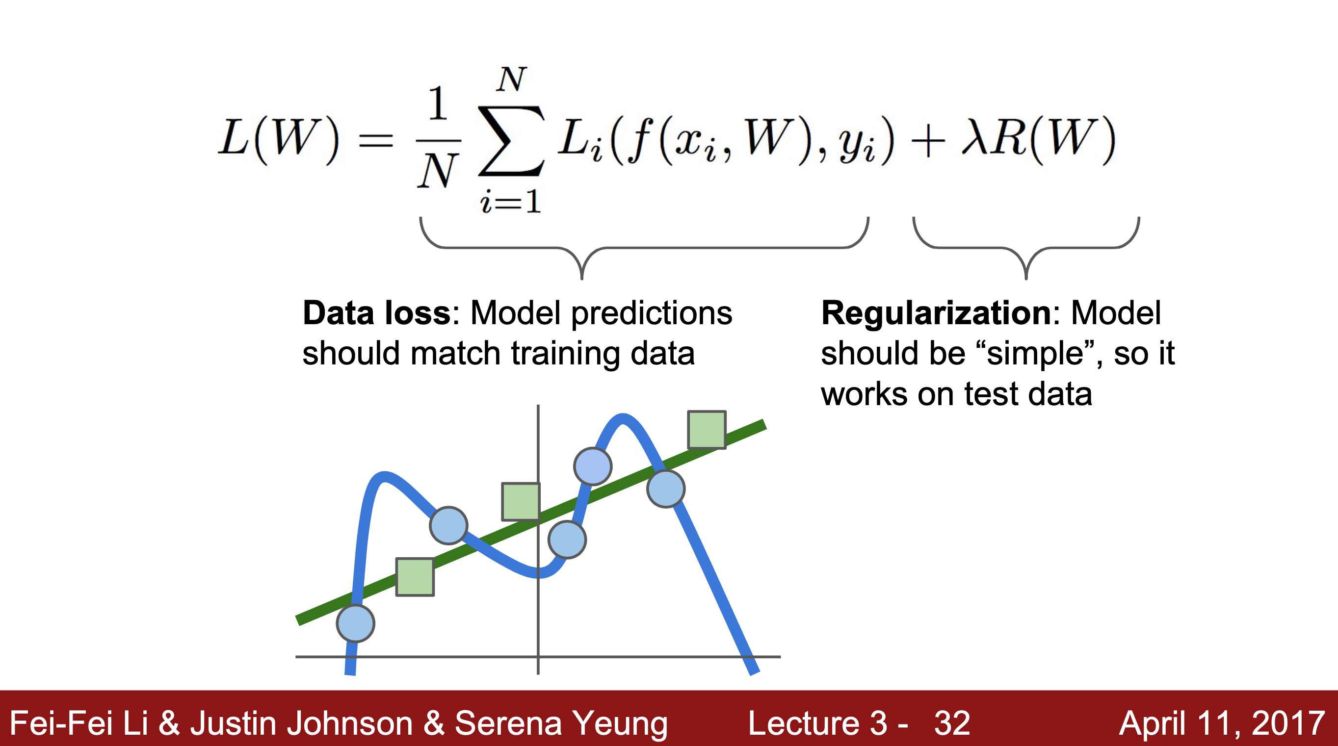 Regulation : 손실 함수에 추가 항(람다 * R(W)) regulation loss를 더해 학습데이터와 테스트 데이터 모두에서 성능이 좋아지게 하는 W를 구하는 방식으로, supervised learning(지도 학습) 방식과 비슷하다.