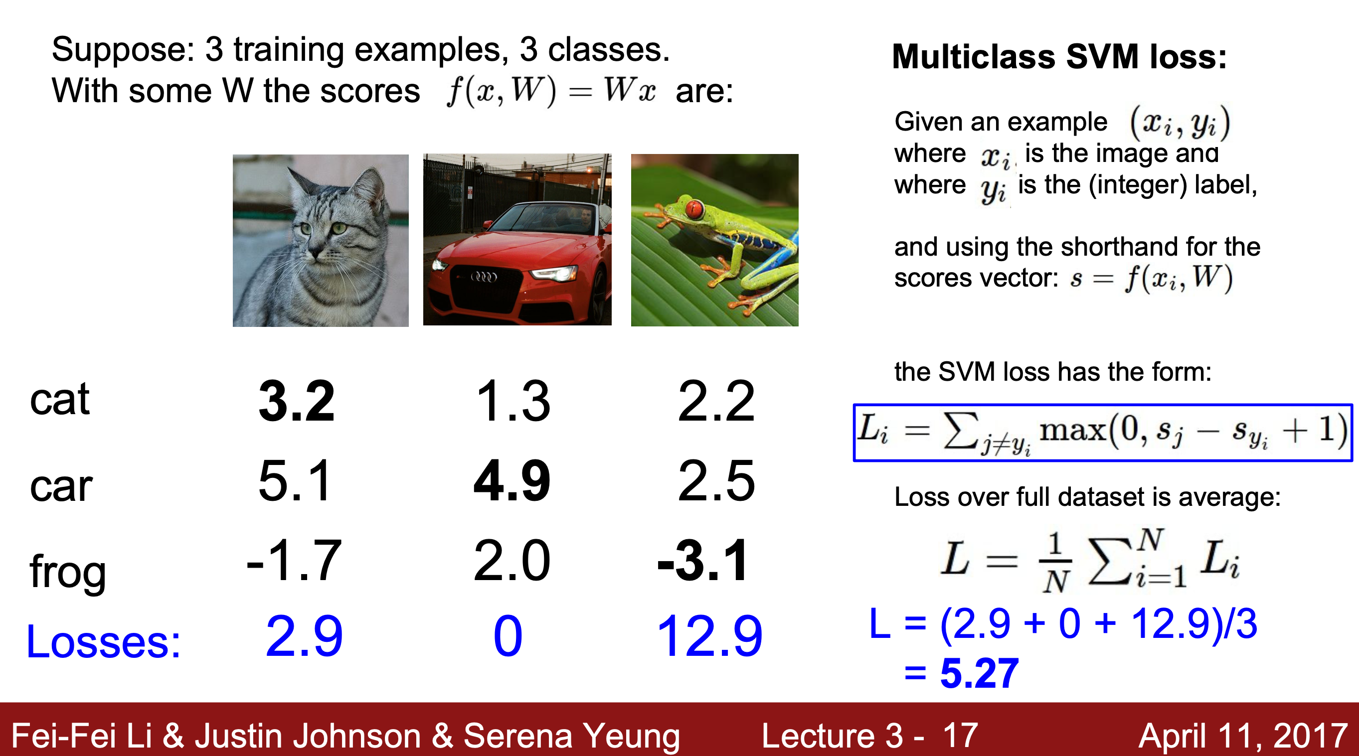 => 그래프 상에서 x축은 정답일 때의 점수, y축은 L을 나타낸다. 정답 클래스를 올바르게 분류했다면 L_i가 0에 가까워지고 그렇지 않으면 L이 선형적으로 감소한다.
