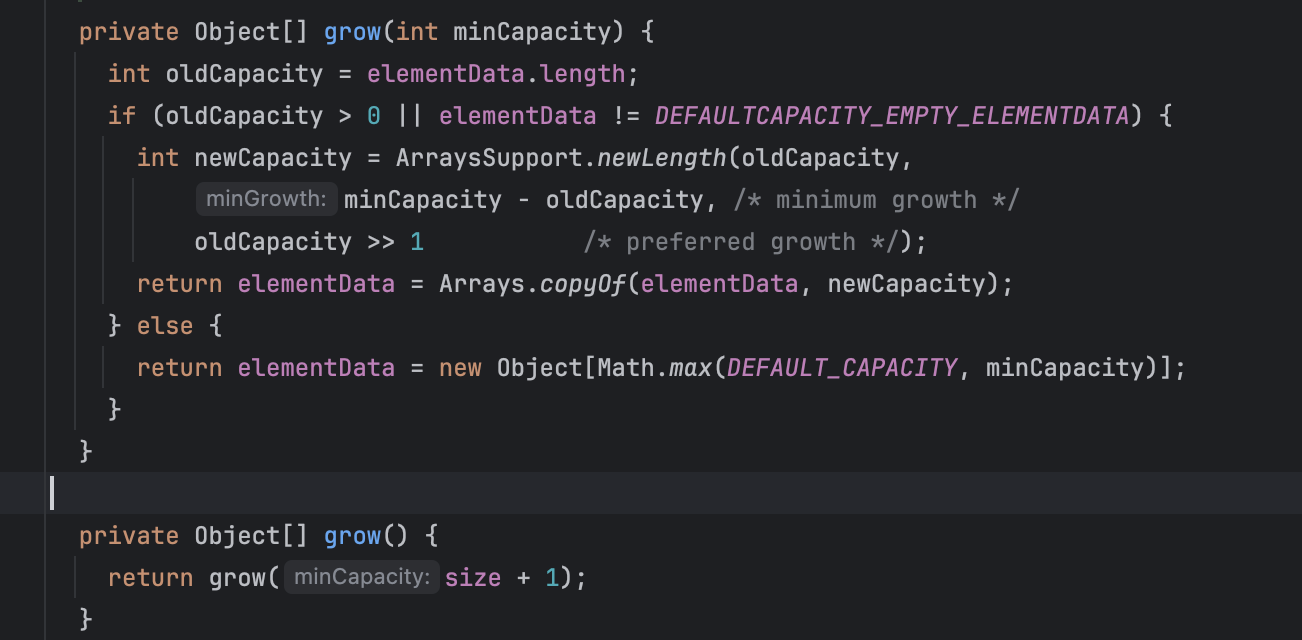 결론부터 말하자면 ArrayList는 grow()라는 함수를 구현하고 있다. 자세한건 아래에서 설명하도록 한다.