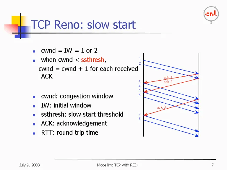 - Slow Start: TCP 전송 시작 시 네트워크 대역폭을 알 수 없으므로, 작은 윈도우 크기(cwnd)에서 시작하여 전송량을 지수적으로 증가.