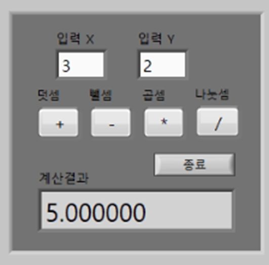덧셈, 뺄셈, 곱셈, 나눗셈, 종료 버튼의 값이 변경될 때 이벤트 구조의 내에 있는 것들이 실행되게 해주었다.