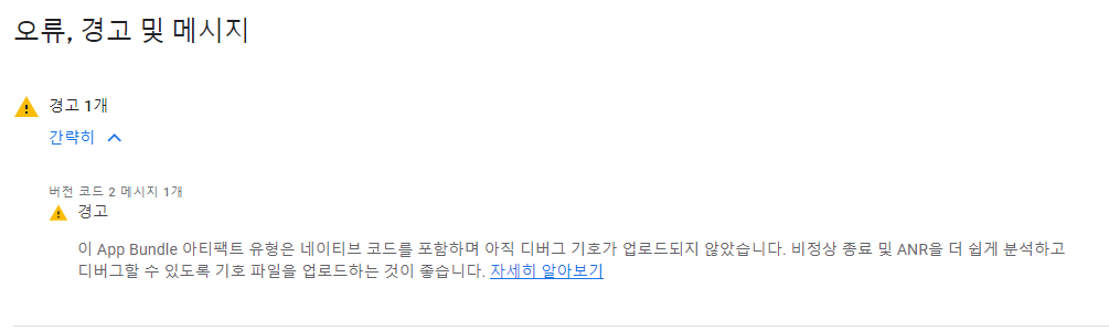 앱 업데이트를 위해 업데이트한 앱번들을 플레이 콘솔에 업로드하면 위와 같이 경고가 뜰 수 있는데