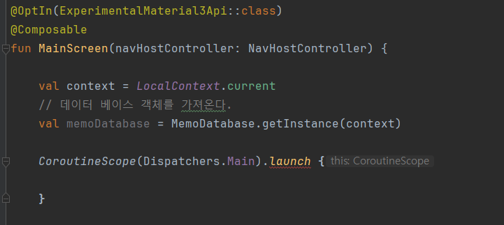 앞의 InputScreen에서 작업한 내용의 경우, onClick안에 코루틴을 작성하는 것은 버튼 UI가 만들어진 후에 사용자가 버튼을 누른다는 것이 확정된 부분이기 때문에 에러가 발생하지 않는 것이다.